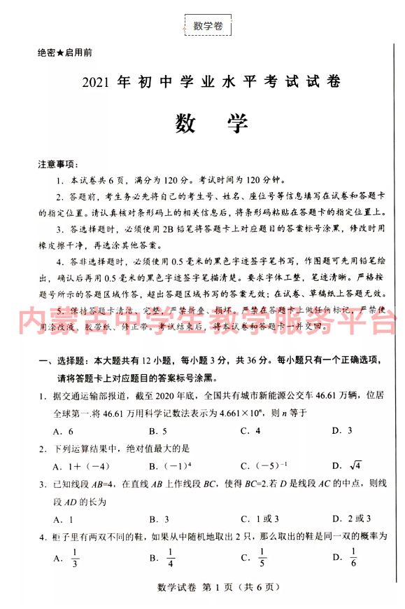 2021年内蒙古包头初中学业水平考试数学试卷