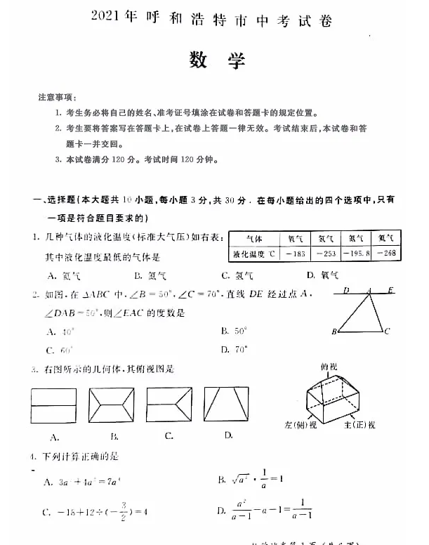 2021年内蒙古呼和浩特初中学业水平考试数学试卷