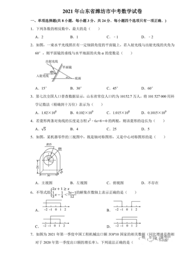 2021年山东潍坊市初中学业水平考试数学试卷