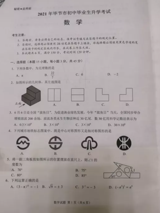 2021年贵州毕节市初中毕业生学业水平考试数学试卷
