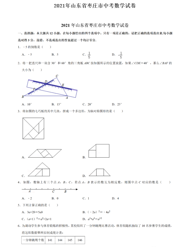 2021年山东枣庄市初中毕业生学业水平考试数学试卷