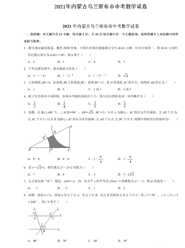 2021年内蒙古乌兰察布初中毕业生学业水平考试数学试卷