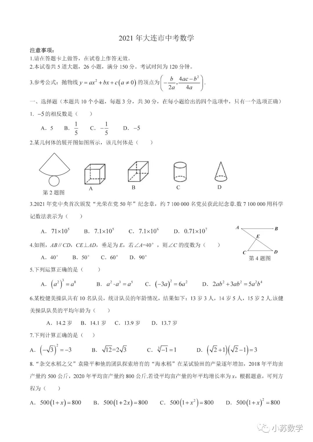 2021年辽宁大连市初中毕业生学业水平考试数学试卷