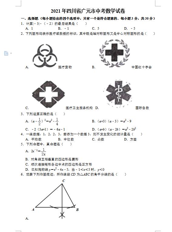 2021年四川广元市初中毕业生学业水平考试数学试卷