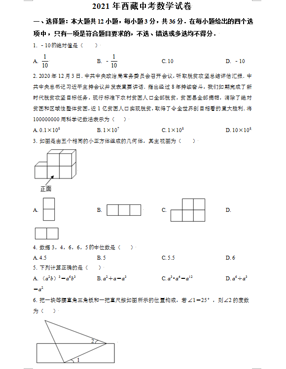 2021年西藏初中毕业生学业水平考试数学试卷