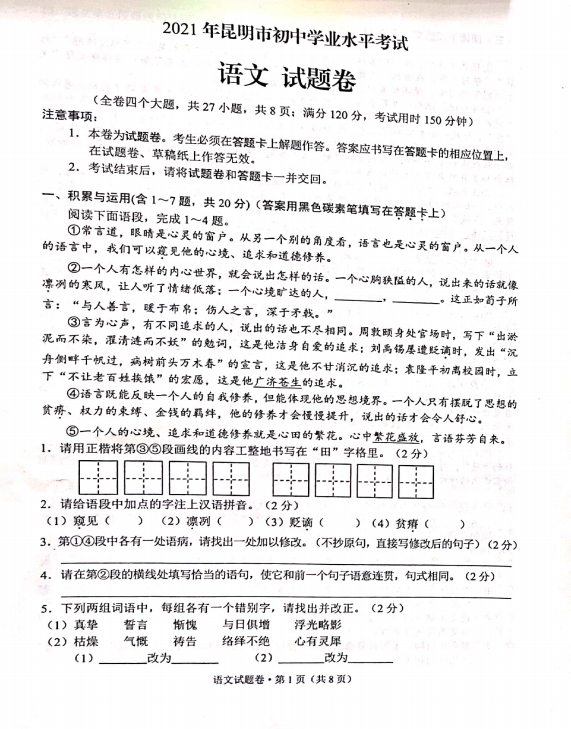 2021年云南省昆明市初中毕业学业水平考试语文试卷