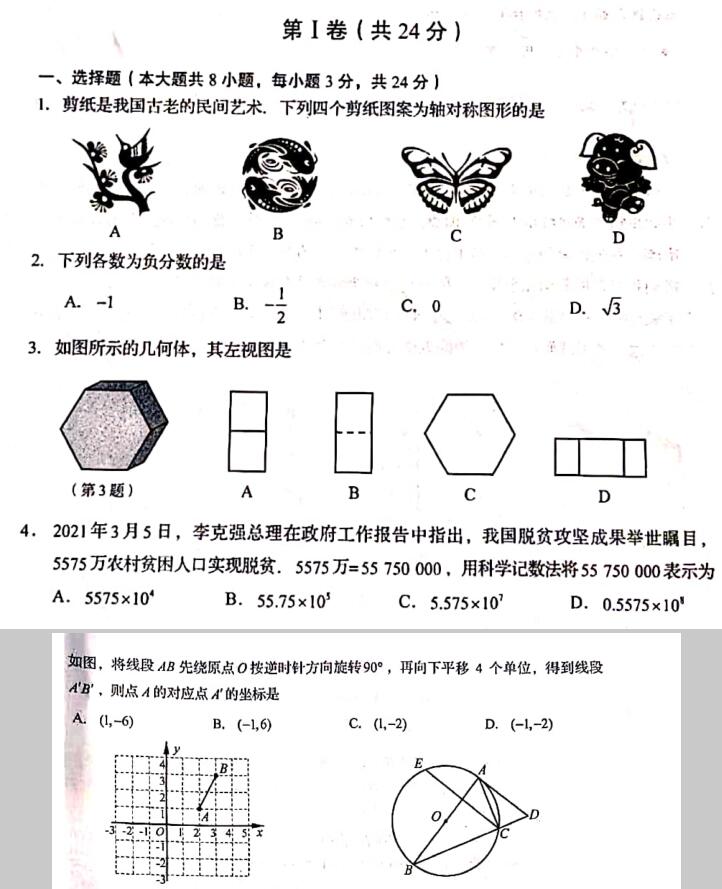 2021年山东青岛初中毕业生学业水平考试数学试卷