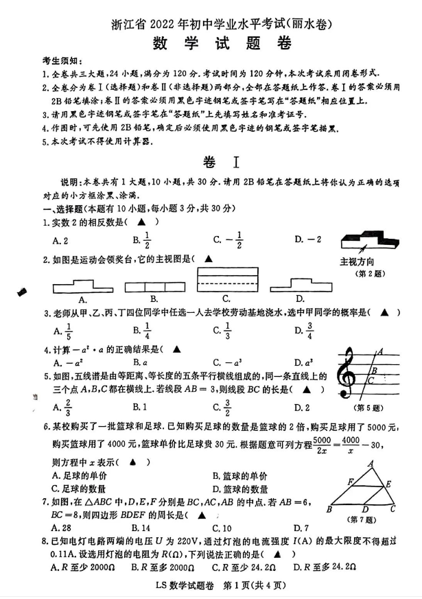 2022年浙江丽水初中毕业生学业水平考试数学试卷