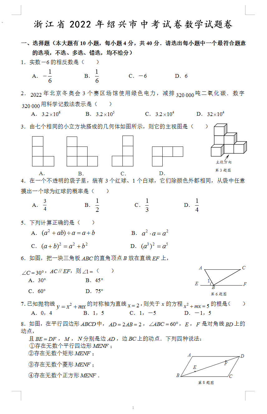 上一篇:2022年浙江省舟山市初中毕业生学业水平考试数学试卷