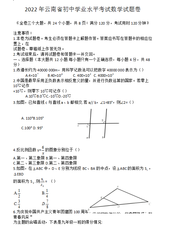 2022年云南省初中学业水平考试数学试题卷