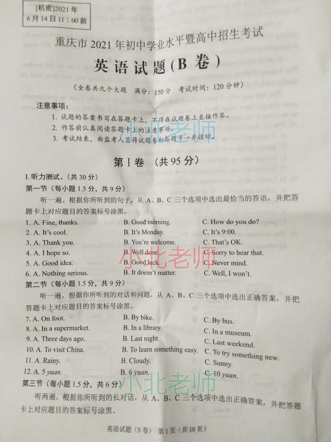 2021年重庆初中学业水平考试英语真题B卷