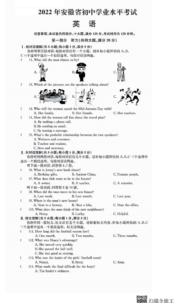2022年安徽省初中学业水平考试英语试卷
