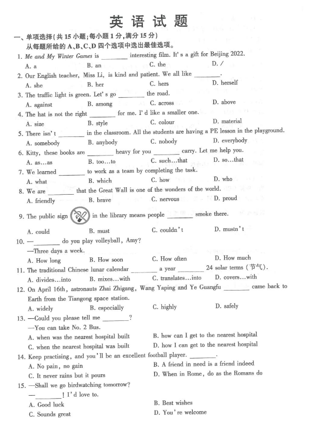 2022年山东省淄博市初中学业水平考试英语试卷