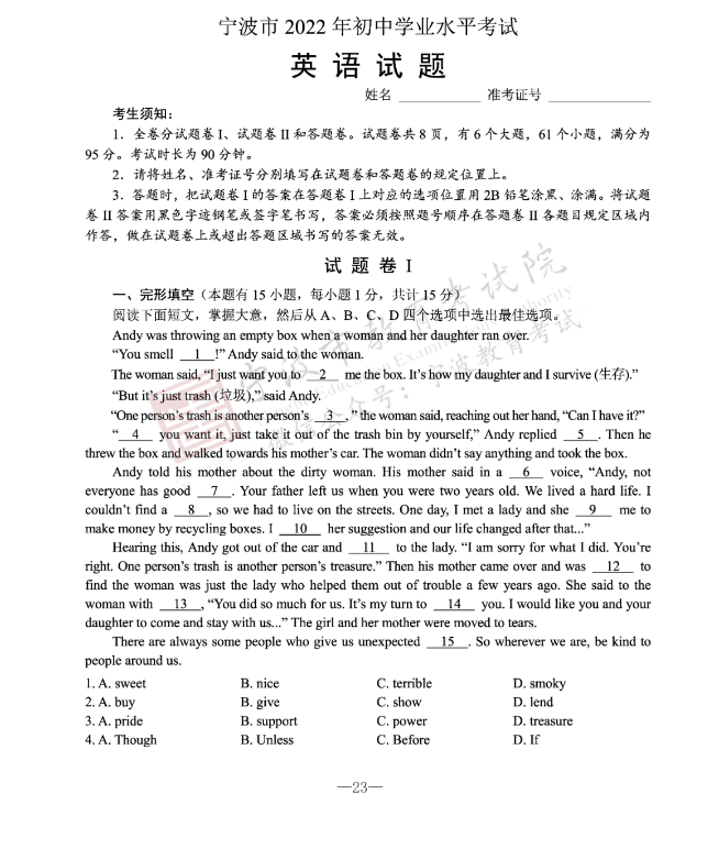 2022年浙江省宁波市初中学业水平考试英语试题卷