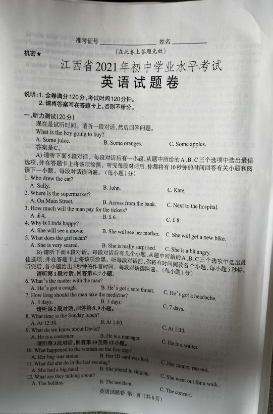 2021年江西省初中学业水平考试英语真题