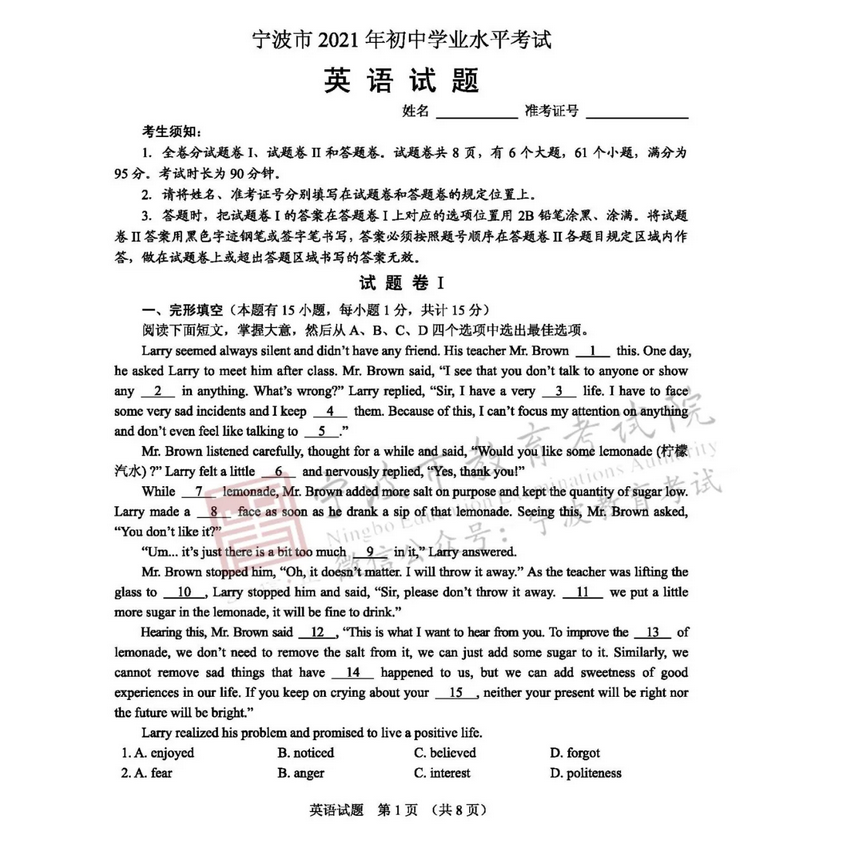 2021年浙江宁波市初中学业水平考试英语真题