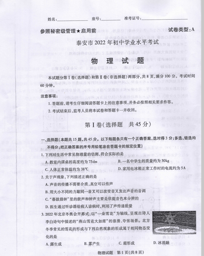 2022年山东省泰安市初中学业水平考试物理试题