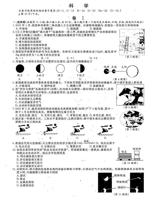 2022年浙江省温州市初中学业水平考试科学试卷