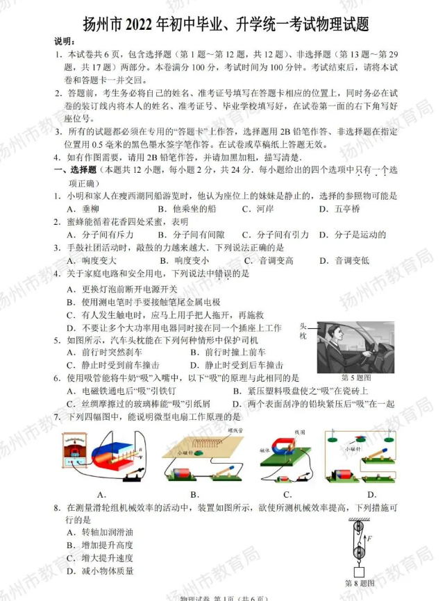 2022年江苏省扬州市初中毕业升学统一考试物理试题