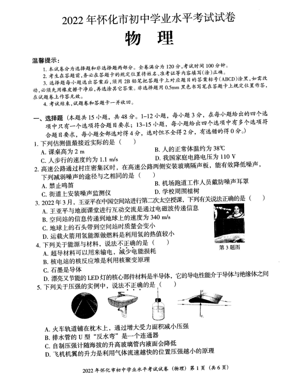2022年湖南省怀化市初中学业水平考试物理试卷