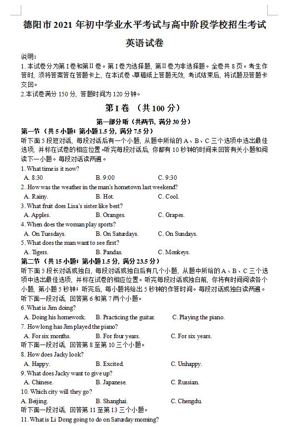 2021年四川德阳市初中学业水平考试英语真题