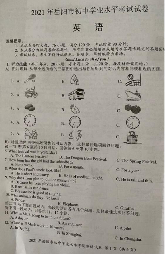 2021年湖南岳阳市初中学业水平考试英语真题