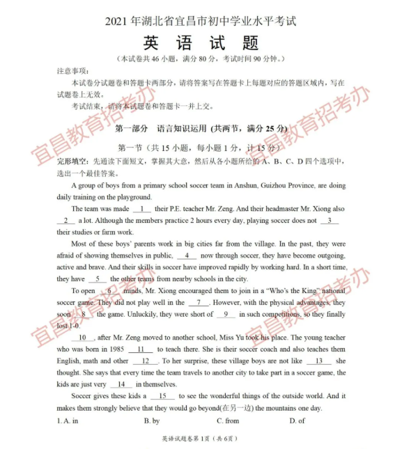 2021年湖北宜昌市初中学业水平考试英语真题