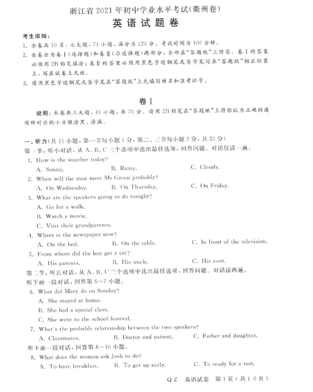 2021年浙江衢州市初中学业水平考试英语真题