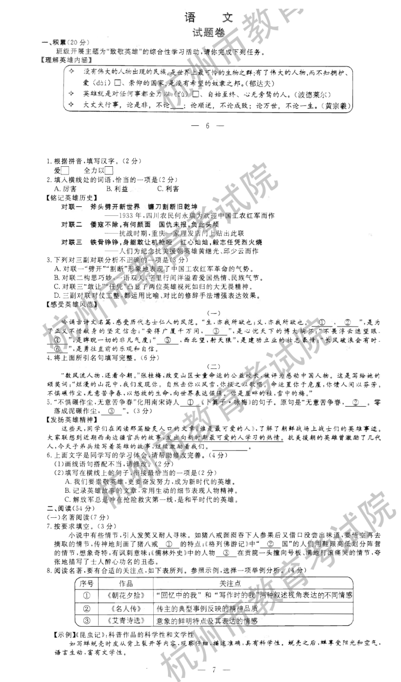 2021年浙江省杭州市初中毕业生学业考试语文试卷