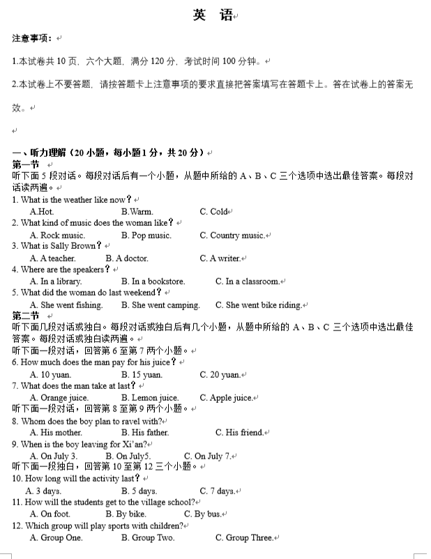 2022年江苏省南通市初中学业水平考试英语试卷