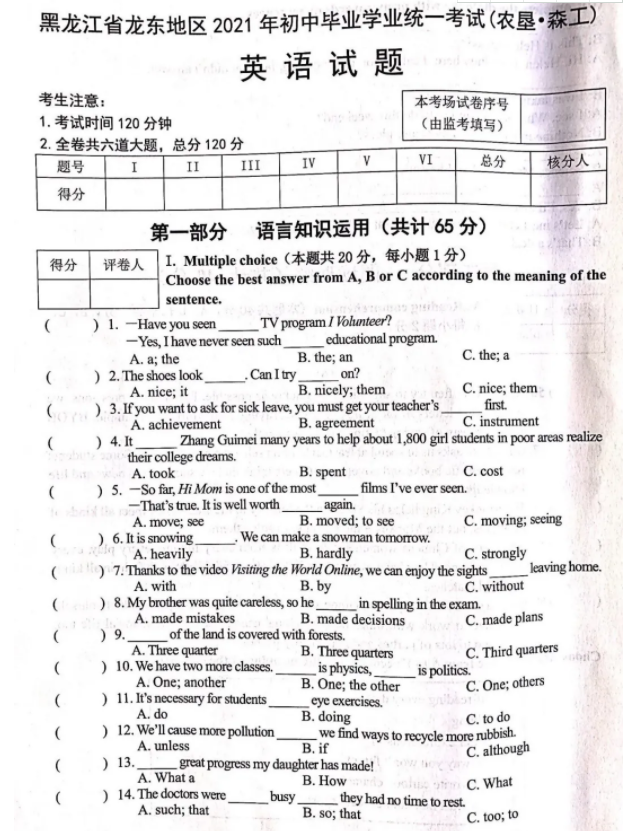 2021年黑龙江龙东地区初中学业水平考试英语真题