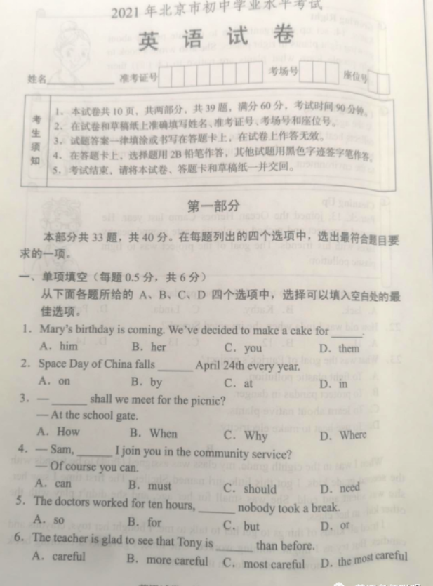 2021年北京市初中学业水平考试英语真题