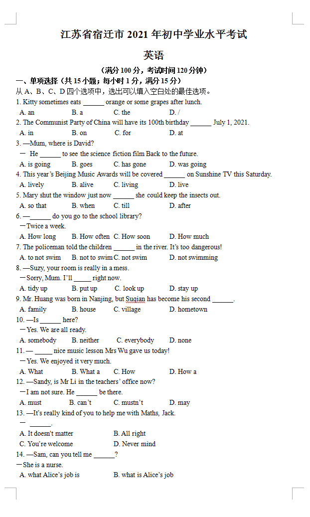 2021年江苏宿迁市初中学业水平考试英语真题