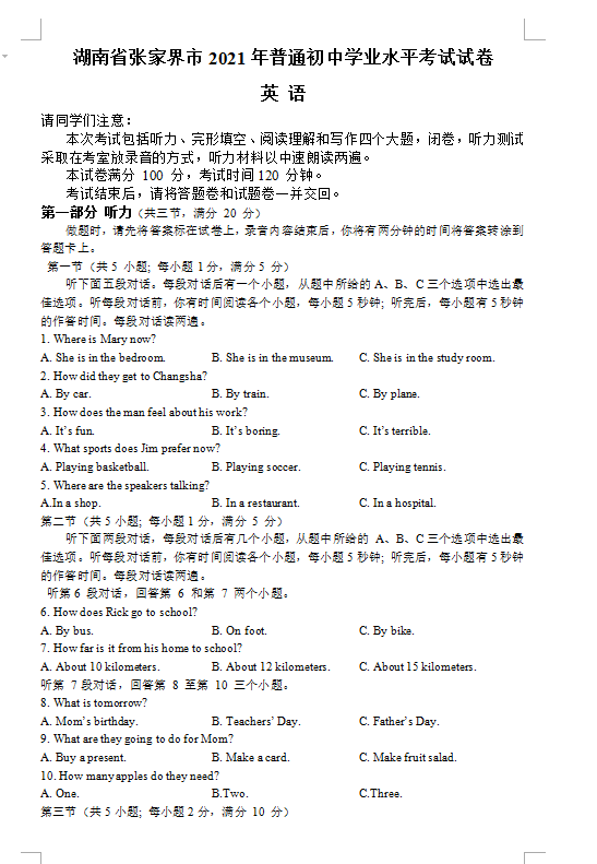 2021年湖南张家界市初中学业水平考试英语真题