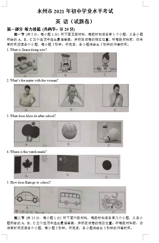 2021年湖南永州市初中学业水平考试英语真题