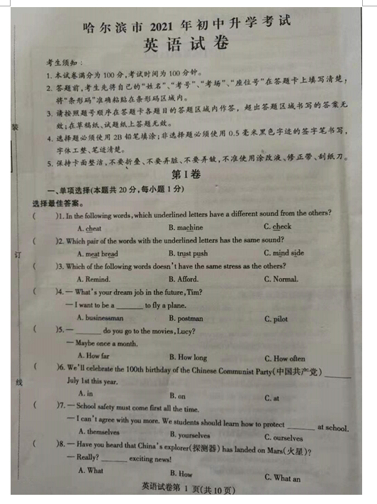 2021年黑龙江哈尔滨市初中学业水平考试英语真题