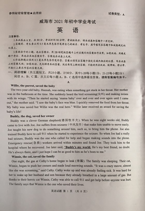 2021年山东威海市初中学业水平考试英语真题