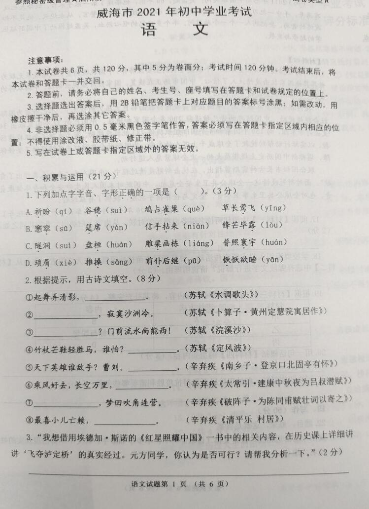 上一篇:2021年四川省达州市初中学业水平考试语文试卷