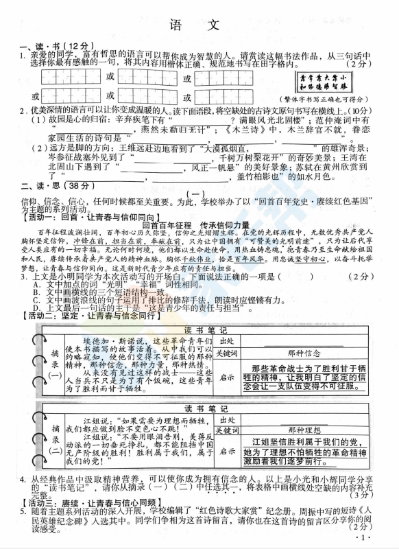 2022年贵州安顺初中毕业学业水平考试语文试卷