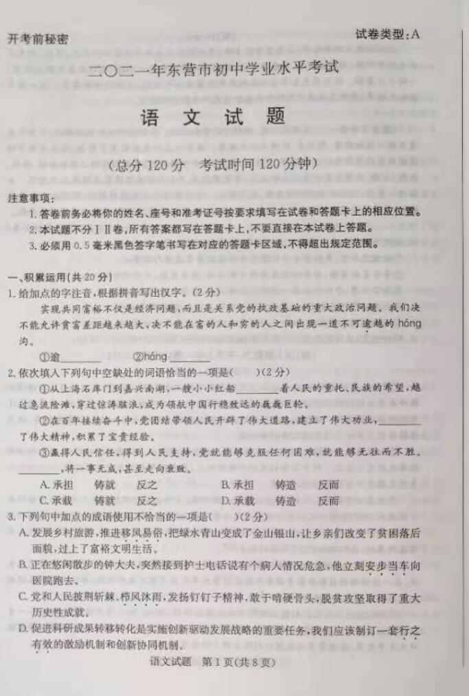 2021年山东省东营市初中学业水平考试语文试卷