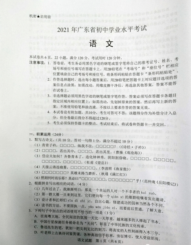 2021年广东省初中学业水平考试语文试卷