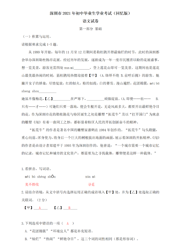 2021年广东省深圳市初中学业水平考试语文试卷