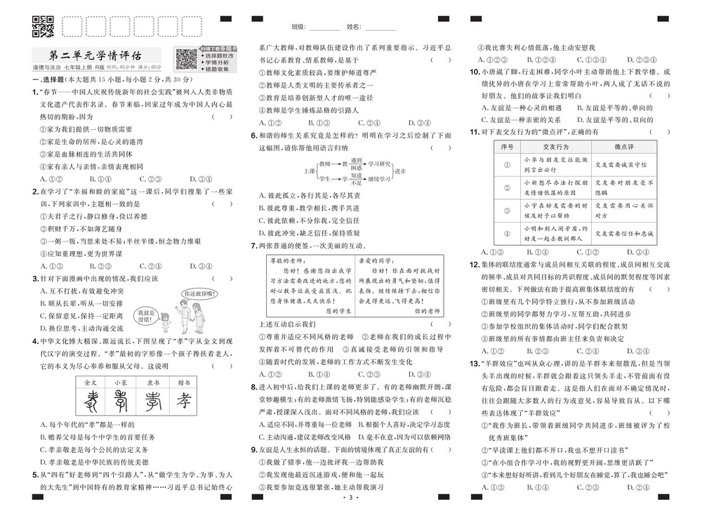 新教材人教版七年级上册道法第二单元测试卷一