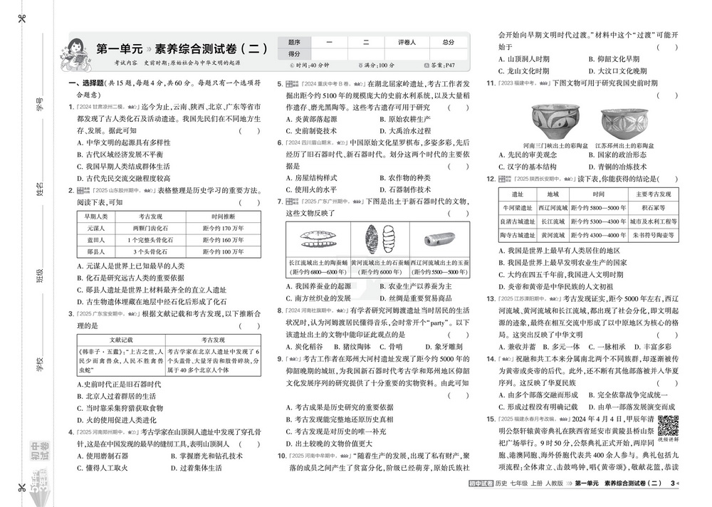 新教材人教版七年级上册历史第一单元测试卷五