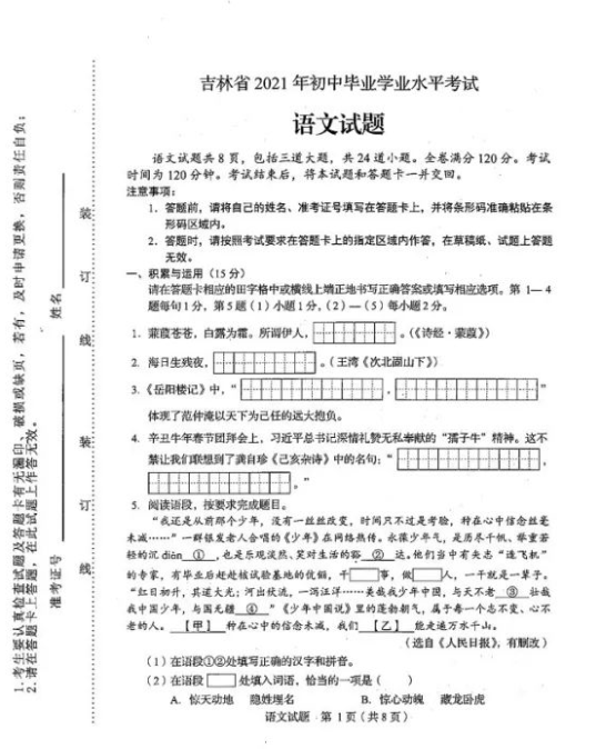 2021年吉林省初中毕业学业水平考试语文试卷