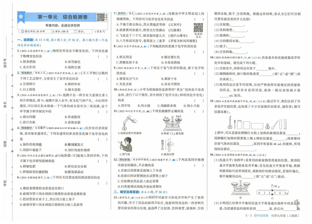 人教版九年级上册化学第一单元测试卷十三