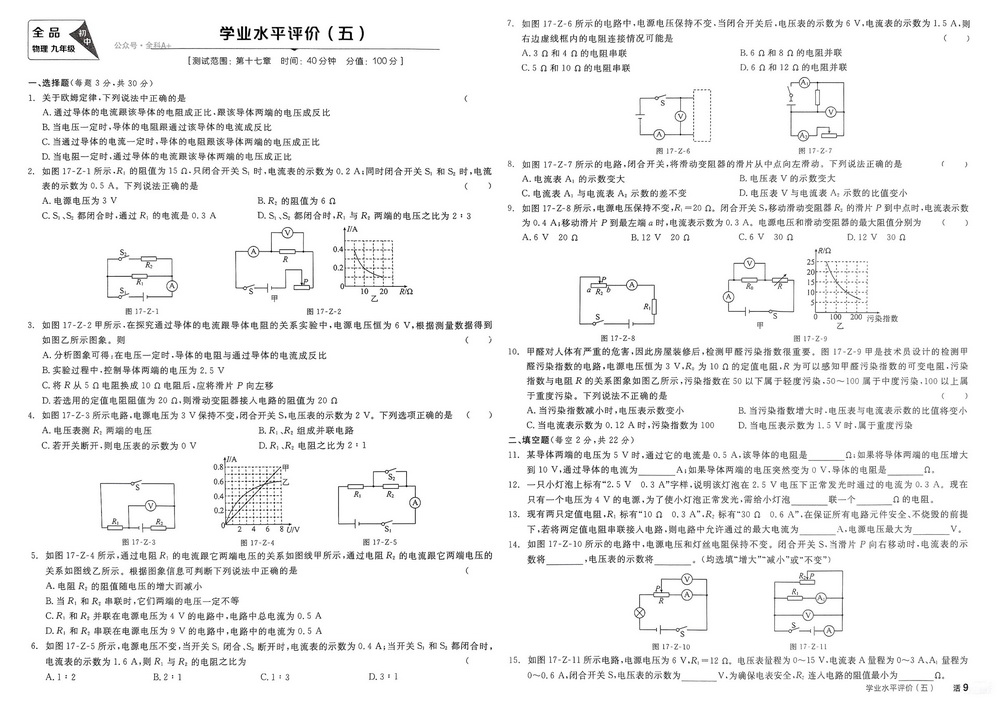 上一篇:人教版九年级上册物理第十七章测试卷七