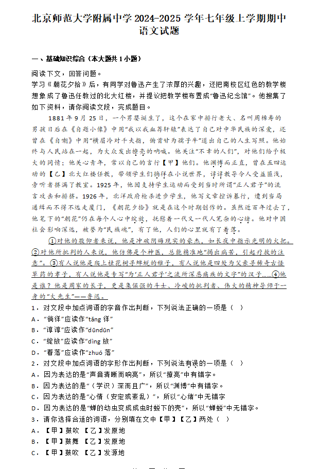 上一篇:合肥市第三十八中学2024-2025学年七年级上学期期中语文试题
