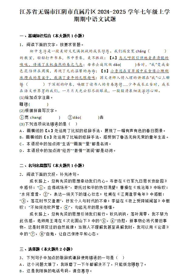 上一篇:湖北宜昌市第一中学2024-2025学年七年级上学期期中语文试题