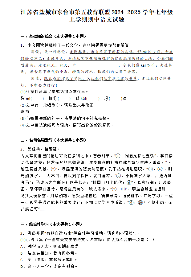 上一篇:江苏省无锡市江阴市直属片区2024-2025学年七年级上学期期中语文试题